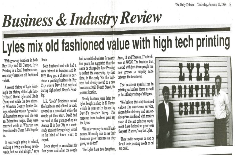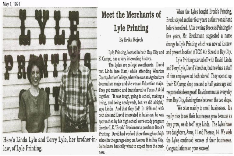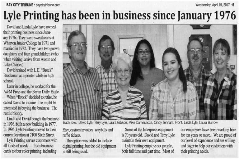 David and Linda Lyle have owned their printing business since January 1976. They were sweethearts at Wharton Junior college in 1971 and married in 1972. They have two grown daughters and four grandchildren (who when visiting, arrive from Austin and Lake Charles)