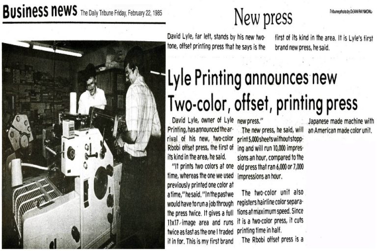 Linda and David bought the business in 1976, built a new building in 1977. In 1995, Lyle Printing moved to their current location at 2100 Sixth Street.