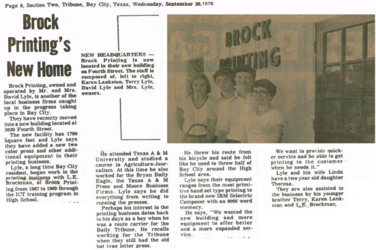David trained with L.E. “Brock” Brockman as a printer while in high school. Later in college he worked for the A & M Press and the Bryan Daily Eagle. When “Brock” decided to retire, he called David to inquire if he might be interested in buying the business. The rest is history.